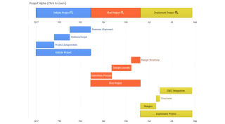 Demonstrates a Gantt chart with JSCharting using unclustered bars, and milestones.