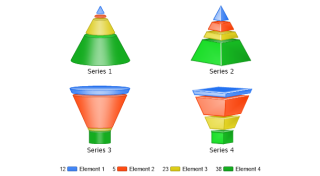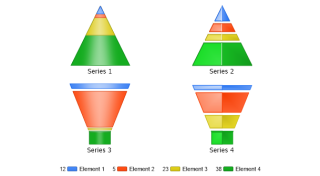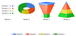 Demonstrates multiple series types in 2D with donut, funnel, pyramid.
