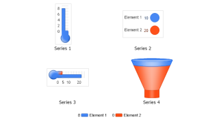 Demonstrates the multiple chart type with pies horizontal and vertical thermometers indicator lights and funnel.