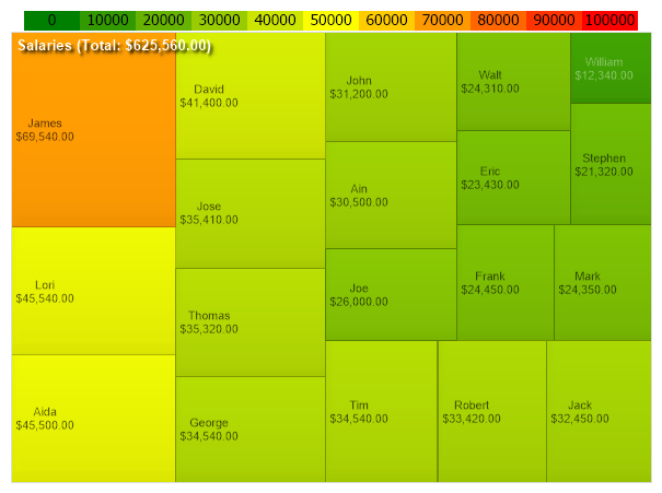 Demonstrates using a TreeMap chart with live data and a multi range color SmartPalette.